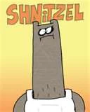 Schnitzel is a very strong Rock Monster. He works for Mung Daal, but does not appear to be a chef himself (no white coat). His dialogue is made up of variations of the word "Radda" which no one has any trouble understanding. Schnitzel is often frustrated by Chowder's impetuous nature (and reckless appetite). Schnitzel is also called on to clean up the messes that inevitably happen with Chowder in the kitchen. He has a fear of rats and he has a strong dislike for Trice Cream. His name comes from the Austrian dish Wiener Schnitzel
